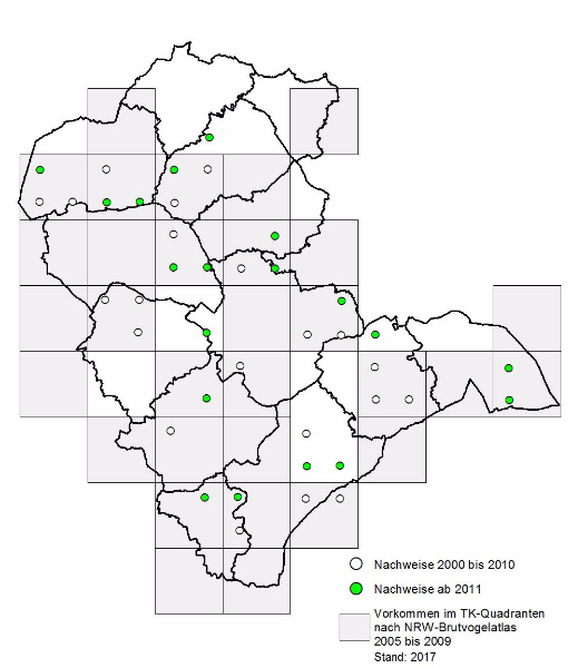 Aufgrund der besonderen Anforderungen an die Nahrung ist der Baumfalke bei uns nur spärlich verbreitet. Langjährig besetzte Brutplätze befinden sich im Bereich der Feuchtwiesenschutzgebiete um Versmold, Halle-Hörste und Rietberg. Im Raum Langenberg, Schloß Holte-Stuckenbrock und Harsewinkel sind weitere Vorkommen bekannt. Aufgrund der Größe der Jagdgebiete dieser Art (bis 30 km2) ist eine Zuordnung von Beobachtungen ohne Kenntnis des Brutplatzes schwierig. Intensivere Erfassungen im Norden des Kreisgebietes (Versmold, Halle) zeigen, dass die Art lokal häufiger auftreten kann. Die verstreuten älteren Nachweise und die Ergebnisse der Kartierungen für den NRW-Brutvogelatlas zeigen eine lückenhafte Verbreitung in großen Teilen des Kreisgebietes. Aus dem Teutoburger Wald und dem direkten Umfeld fehlen Brutnachweise.