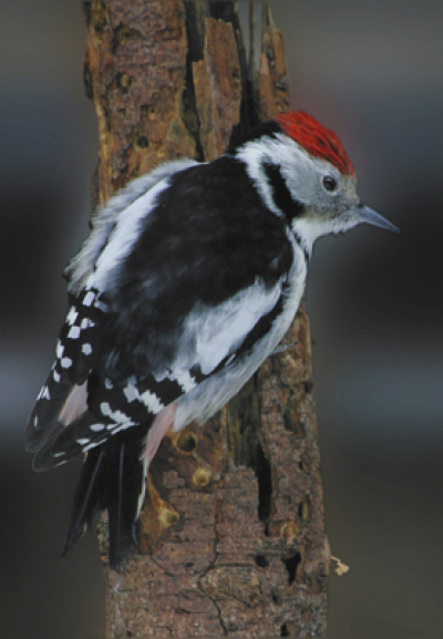 Der Mittelspecht bevorzugt Bäume mit rauer Borke, weshalb er auch als Leitvogelart für alte Eichenwälder gilt. Vom Mittelspecht besiedelte Laub- und Laubmischwälder weisen stets einen hohen Altholz- und Totholz-Anteil auf. Alte Bäume sind auch für den Höhlenbau wichtig, da sie geeignete Faulstellen und tote Seitenäste aufweisen, an denen er bevorzugt baut. Die Nahrung des Mittelspechtes besteht überwiegend aus Insekten und anderen Wirbellosen, die in der grobborkigen Rinde der Bäume leben. Im Herbst und Winter wird auch viel pflanzliche Nahrung (u.a. Bucheckern, Eicheln) aufgenommen.