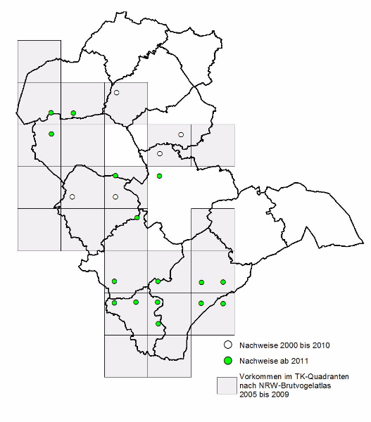 Die Rohrweihe konnte in den letzten Jahren einige neue Brutgebiete im Ostmünsterland besiedeln. Die Anlage von Teichen und Wiesenblänken hat sich hier positiv ausgewirkt und zu Ansiedlungen z.B. im NSG „Versmolder Bruch“ und im NSG „Feuchtwiesen Hörste“ geführt. Ein traditionelles Brutgebiet stellen die „Rietberger Fischteiche“ und die „Rietberger Emsniederung“ dar, wo die Art alljährlich vorkommt. Weitere Nachweise liegen vom Axtbach in Herzebrock-Clarholz und aus Steinhagen vor. In jedem Jahr gibt es zudem einzelne Hinweise auf Bruten in Getreidefeldern z.B. im Raum Harsewinkel. Eine Lokalisierung der Brutplätze ist jedoch wegen der großen Jagdgebiete der Rohrweihe sehr schwierig und zeitaufwendig.