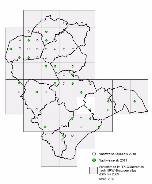 Die Schleiereule kommt in NRW ganzjährig vor. Im Kreis Gütersloh liegen nur regional gute Daten zur Verbreitung vor. Im Raum Versmold, Borgholzhausen und Halle wurden an Höfen Nistkästen aufgehängt, die regelmäßig kontrolliert werden. Dort zeigt sich, dass die Schleiereule die Landschaft flächendeckend besiedelt, wenn geeignete Brutmöglichkeiten vorhanden sind. Dies trifft auf das Ostmünsterland und vermutlich auch das Ravensberger Hügelland zu. Die waldreichen Regionen des Teutoburger Waldes und größere Waldgebiete werden dagegen gemieden.
