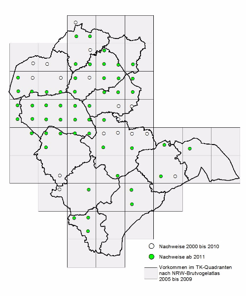 Der Waldkauz ist ein Standvogel, der das ganze Jahr über in seinem Revier bleibt. Die Verbreitung im Kreis Gütersloh ist nur schlecht dokumentiert. Die Verbreitungskarte zeigt eine auffällige Häufung im Norden des Kreises, die aber auf einer intensiveren Erfassung beruht. Aufgrund seiner Anpassungsfähigkeit ist von einer weiten Verbreitung der Art im ganzen Kreisgebiet auszugehen.