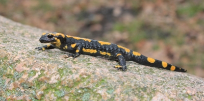 Der Feuersalamander, unverkennbar durch seine leuchtend gelbe Warnfärbung, setzt im Gegensatz zu allen anderen heimischen Lurchen keinen Laich, sondern bereits weit entwickelte Larven ins Wasser ab. Er bewohnt hauptsächlich Laub- und Mischwälder, am liebsten in feuchten Schlucht- und Hanglagen. Als ausgesprochenes Waldtier, schafft es der Feuersalamander nur sehr schlecht Landstriche, die nach längerer waldfreier Zeit wieder aufgeforstet wurden, wieder zu besiedeln. Der bevorzugte Lebensraum der Larven sind naturnahe Quellbäche und Quellkolke. Um nicht von der Strömung fortgespült zu werden, benötigen die Larven ruhige Bachbereiche, die bei einer Begradigung des Gewässers verlorengehen.