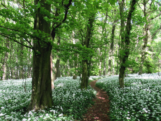 Das Bild des Kalk-Buchenwaldes wird bestimmt durch seine ausgedehnten Perlgras-Bestände (Melica uniflora). In diesen eingestreut finden sich Arten wie Waldgerste (Hordelymus europaeus), Gelbes Windröschen (Anemone ranunculoides), Frühlings-Platterbse (Lathyrus vernus) und Hohler Lerchensporn (Corydalis