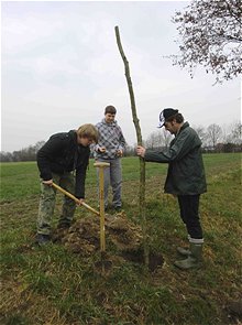Engagement für den Artenschutz zeigten vier Schüler der Gemeinschaftsschule Langenberg: Ausgerüstet mit Spitzhacke und Spaten pflanzten sie zwölf neue Kopfweiden am Feldrand von Landwirt Stefan Venker-Metarp. Einen Meter tief im Boden sitzen die Stangen, knapp zwei Meter ragen sie aus der Erde heraus. Auf dem nassen Untergrund werden die anspruchslosen Gehölze schnell Wurzeln schlagen und austreiben. Mit ihrem Blütenreichtum bieten sie einer Vielzahl an Insekten ein gutes Nahrungsangebot. Die natürlichen Hohlräume der älteren Weiden können von zahlreichen Höhlenbrütern, wie Fledermäusen und Steinkäuzen, als Nistplatz genutzt werden. Die Schüler der 8. Klasse meldeten sich freiwillig auf den Aufruf des Biologielehrers Silvio Braunholz, der selbst auch tatkräftig dabei ist. |