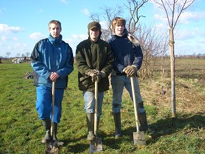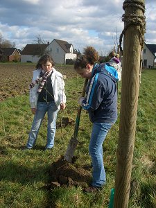 14 Schüler der Langenberger Konrad Adenauer Schule fassen tatkräftig mit an, als bei Wind und Wetter (Windstärke 5!) knapp 200 Sträucher, wie Hasel, Schneeball, Schwarzdorn, Rose und Pfaffenhütchen eingepflanzt werden!