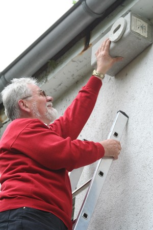 April 2011: Ehrenamtliche Vogelfreunde bringen Nisthilfen für Mauersegler an