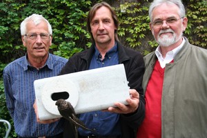 | Horst Domass, Bernhard Walter und Jörg Grossjohann (Bild: Susanne Barth, NW) Horst Grossjohann beim Anbringen eines Mauersegler-Nistkastens (Bild: Susanne Barth, NW) |