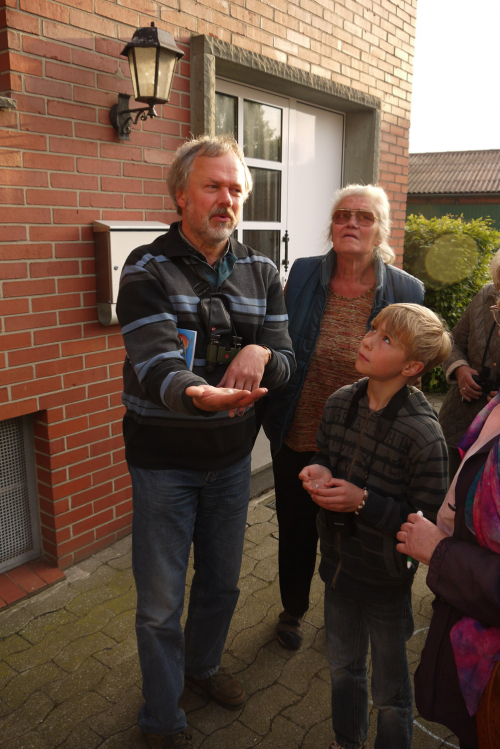 Große und kleine Vogelfreunde folgten der Einladung der Biologischen Station und dem Umweltamt der Stadt Gütersloh zur Exkursion durch die Isselhorster Innenstadt. Schon zu Beginn der abendlichen Wanderung konnte die interessierte Gruppe eine Kolonie Mauersegler über dem Kirchplatz beobachten. Hoch in der Luft kreisten die ausgezeichneten Flugkünstler mit ihren sichelförmigen, schmalen Flügeln - unverkennbar auch durch ihre lauten „srii-srii“- Rufe. Nach ihren Jagdausflügen kehren die Segler zu ihren Jungen zurück, die in den Nestern gierig auf Nahrung warten. An verschiedenen, mehrgeschossigen Gebäuden konnten wir die eleganten Segler dabei beobachten, wie sie durch kleine Einfluglöcher ihre Jungen aufsuchten. Das Brutgeschäft ist nicht nur in natürliche Nester unter den Dächern, sondern auch in den künstlichen Nisthilfen am ehemaligen Brennereigebäude Elmendorf in vollem Gange.