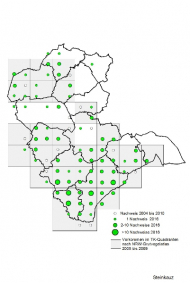 | Der Steinkauz war bis Mitte des 20. Jahrhunderts ein in Mitteleuropa verbreiteter und regional sogar häufiger Brutvogel. Inzwischen steht er u.a. in Deutschland auf der Roten Liste der bedrohten Brutvogelarten in der Kategorie „stark gefährdet“. In Nordrhein-Westfalen wird er als „gefährdet“ eingestuft, wobei das Land sogar einen mitteleuropäischen Verbreitungsschwerpunkt darstellt. Im Kreis Gütersloh und Bielefeld wurden im Jahr 2011 191 Brutpaare des Steinkauzes nachgewiesen. Der Verbreitungsschwerpunkt ist im Süden des Kreises zu finden (siehe Abbildung) ist. |