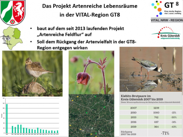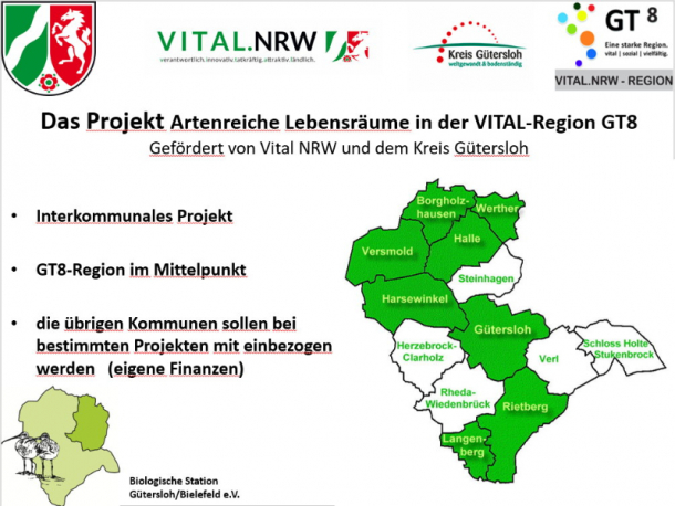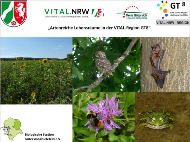 In Langenberg wurden 2019 nach einer Besichtigung mit Vertretern der Stadt Langenberg und der Beratung durch die Biologische Station im Rahmen des VITAL-Projektes auf einer öffentlichen artenarmen Grünlandfläche (Kompensationsfläche) mehrere Blühstreifen angelegt und mit Regiosaatgut eingesät. Inzwischen hat sich die Wiese auch dank der Bewirtschaftungsweise, zu der die Biologische Station geraten hatte, zu einer ausserordentlich blütenreichen Wiese entwickelt, ein Vorzeigeprojekt der Stadt Langenberg.