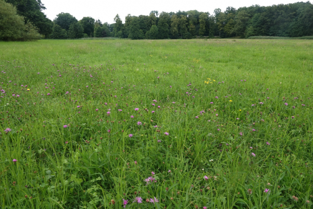 In den Feuchtwiesen ("Schlosswiesen") bestimmen neben typischen Feucht-wiesenpflanzen wie Sumpf-Hornklee und Trauben-Trespe auch selten gewordene Feuchtwiesen- und Grünlandarten, u.a. die Kuckucks-Lichtnelke, das Wasser-Greiskraut und die Wiesen-Flockenblume den Blütenaspekt. |