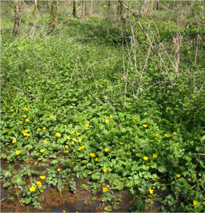 Scharbockskraut und Schwertlilie an vielen Stellen im Erlenbruch. Im Erlenbruch finden aber auch seltene Seggenarten wie die Wunder-Segge, die Steife Segge und die Walzen-Segge noch einen Lebensraum.