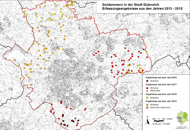 Die Biologische Station hat von 2015 bis 2018 eine umfassende Erfassung der Goldammer im Stadtgebiet Gütersloh durchgeführt. Dabei konnten 143 Brutpaare sowie 2 singende Männchen nachgewiesen werden. Zur Förderung der Goldammer hat die Biostation eine Hecke in Niehorst gepflanzt. Fernerhin hat sie zahlreiche Landwirte hinsichtlich der Anlage von Blühstreifen beraten. Das Projekt wird seit 2015 durch die Stiftung der Sparkasse Gütersloh gefördert . |