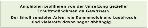 Die Amphibien gehören weltweit inzwischen zu den bedrohtesten Tiergattungen und sind von starken Bestandsrückgängen betroffen. Neben den Auswirkungen von neuen Verkehrswegen, der Trockenlegung vieler Kleingewässer und einer zunehmenden Intensivierung der Landbewirtschaftung, haben auch klimatische Veränderungen negativen Einfluss auf die Lebensbedingungen der Amphibien. Länger anhaltende Trockenperioden führen vielerorts zu einem Verlust von Wasserlebensräumen.