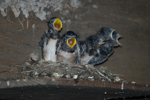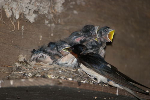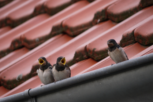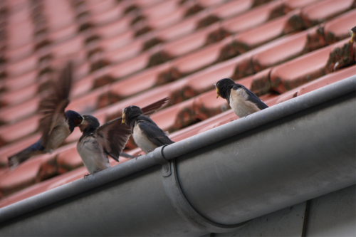 Ende August sind sind nun langsam auch die letzten kleinen Schwalbenjunge flügge. Wenn sie nach der Nestlingsphase ausfliegen, werden sie die ersten Tage noch von ihren Eltern gefüttert. Gewärmt von der Sonne sitzen hier die Jungen auf einer Dachrinne, die Altvögel immer schön im Blick. Nähert sich einer der Eltern, schreien die hungrigen, gelben Kehlen gierig nach Nahrung. Bald sammeln sich die Schwalben und machen sich im September auf den langen Weg ins Winterquartier ins ferne Afrika südlich der Sahara.