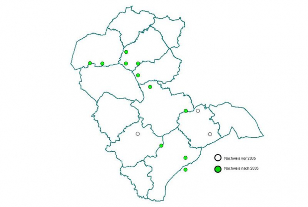 An vielen Blänken in sechs von 13 Feuchtwiesenschutzgebiete des Kreises Gütersloh nachgewiesen. Verbreitungsschwerpunkte liegen in den NSGs "Feuchtwiesen Hörste", "Feuchtwiesen Vennheide", "Versmolder Bruch" und "Rietberger Emsniederung".
