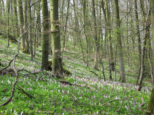 Um die große Artenvielfalt der Kalk-Buchenwälder zu erhalten, ist vor allem eine naturnahe Waldbewirtschaftung notwendig, die einen hohen Anteil an Alt- und Totholz zulässt und Höhlenbäume schont. In den lichteren ehemaligen Niederwaldbereichen ist bei der Bewirtschaftung auf eine ausreichende Lichtstellung des Waldbodens zu achten. Eine Aufforstung mit Fichten-Monokulturen ist auf Kalk-Standorten besonders negativ zu beurteilen, weil dadurch meist die gesamte artenreiche Vegetation am Waldboden vernichtet wird. In letzter Zeit ist infolge des hohen Stickstoffeintrages über die Luft eine starke Ausbreitung stickstoffliebender Arten (Wald-Bingelkraut, Bärenlauch) zu beobachten, die konkurrenz-schwächere Arten wie die Lerchensporne großflächig zu verdrängen drohen. Um diese Entwicklung zu stoppen, sind dringend Maßnahmen zur Verringerung der Stickstoff-Emissionen aus Landwirtschaft und Verkehr erforderlich. Zunehmend wird auch die Bedeutung einer ausgewogenen Besucherlenkung offensichtlich. Es müssen gezielt ökologisch unproblematische Wege in gutem Ausbauzustand angeboten werden und dafür kleinere Wege und Trampelpfade, die sich oft „wild“ auf ehemaligen Rückegassen bilden, geschlossen werden. Nur so können bei dem zunehmenden Druck durch Freizeitaktivitäten, wie Wandern oder Mountain-Biking, auch ungestörte Bereiche erhalten werden, die Rückzugsmöglichkeiten insbesondere für größere Tiere wie Reh (Capreolus capreolus) oder Wildschwein (Sus scrofa) bieten.