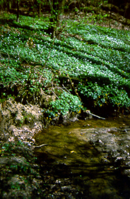 Aber auch andere Arten tragen zur Ästhetik der Quellbäche bei. Hierzu gehört z.B. als recht selten gewordener Bewohner der Quelltäler der mit seinen silbrig-weiß leuchtenden Sprossen sehr auffällige Riesen-Schachtelhalm (Equisetum telmateia), unsere größte heimische Schachtelhalm-Art.