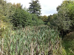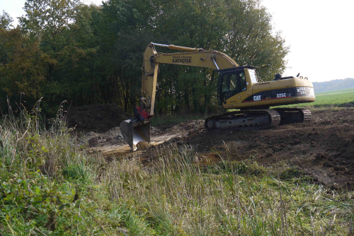 Für Frösche war dieses Gewässer, ein ehemaliger Altarm des Fortbaches in Langenberg, schon länger nicht mehr attraktiv. Der Rohrkolben hatte sich über die gesamte Wasserfläche ausgebreitet und hohe Gehölze am Südufer beschatteten das Gewässer. Eine dicke Moderschicht im Gewässergrund ließ auf eine schlechte Wasserqualität schließen. Die Biologische Station hat dieses Gewässer im Oktober 2011 durch aufwendige Gehölz- und Baggerarbeiten saniert. Schon im nächsten Frühling kann es als neuer Lebensraum für eine Vielzahl an Pflanzen- und Tierarten dienen. |