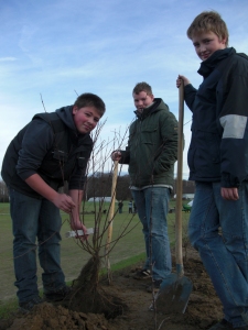 | Kräftig angefasst haben dann 23 Schüler der Konrad-Adenauer Schule in Langenberg: Rund 350 heimische Sträucher, wie Hasel, Rose, Schlehe, Hartriegel und Weißdorn pflanzten die emsigen Schüler rund um das Grundstück. Als blühende Lebensader wird die neue Hecke einer vielfältigen Tier- und Pflanzenwelt Lebensraum bieten. Mit ihrem Blütenreichtum im Frühjahr und ihrem Fruchtangebot im Herbst wird das Nahrungsangebot für zahlreiche Vogel- und Insektenarten erhöht. Die Vögel, so auch der Steinkauz, profitieren von den angelockten Insekten, die sie u.a. für die Aufzucht ihrer Jungen benötigen. Außerdem werden die oft dornigen Gehölze von Vögeln als Brutplatz, Singwarte, Versteck und Ansitz zur Jagd genutzt. Auf der Fläche hat Herr Brockmann eine extensive Wiesenmischung ausgebracht. Mit der Pflanzung von sechs Obstbäumen kann sich eine ökologisch sehr wertvolle, extensive Obstwiese entwickeln. | |
