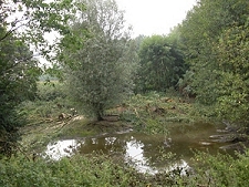 | Das Laubfroschgewässer vor den Optmierungsmaßnahmen: Gehölze (hauptsächlich schnellwachsende Erlen) stehen rund um das Gewässer und beschatten es. | |