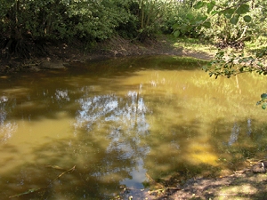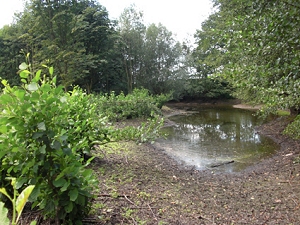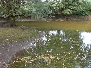 | Das einfallende Laub ist in dem Wasser vermodert - eine dicke Schlammschicht bedeckt den Gewässergrund, so dass mittlerweile alle Wasserpflanzen (bis auf vereinzelt ein paar Algen) abgestorben sind. Das Wasser ist trüb. | |