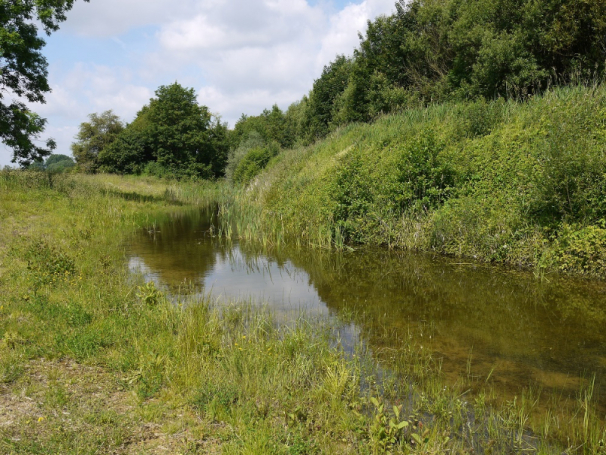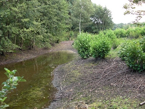 | Unmittelbar nach den Baggerarbeiten sieht das Gewässer noch etwas kahl aus. Doch hat es sich schnell wieder mit Wasser gefüllt und das Ufer hat sich von selbst begrünt. Der Laubfrosch lässt erst mal auf sich warten.. doch im Frühjahr 2014 konnten wir den ersten Laubfrosch an dem optimierten Artenschutzgewässer nachweisen! |