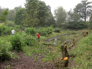 August 2008: Sanierung eines Gewässers für den Laubfrosch! Etwa zehn rufende Laubfroschmännchen konnten die Mitarbeiter der Biologischen Station an dem Gewässer in Rietberg schon von weitem hören, als sie an einem warmen Abend im Mai die Frösche erfassten. Doch das Gewässer entsprach mittlerweile nun gar nicht mehr den Ansprüchen des kleinen Froschkönigs: das Wasser konnte sich infolge der Beschattung vieler Bäume ringsherum kaum erwärmen. Außerdem hatte sich aufgrund des einfallende Laubes der Bäume eine dicke Schlammschicht gebildet. Sämtliche Wasserpflanzen (bis auf ein paar Algen) waren abgestorben, so Damit der Laubfrosch dieses Gewässer auch in der Zukunft als Laichgewässer nutzen kann, waren dringend Optimierungsmaßnahmen notwendig! Die Biologische Station führte in Absprache mit dem Eigentümer Gehölz- und Baggerarbeiten durch, um das Gewässer für den kleinen, grünen Frosch als Lebensraum zu erhalten. |