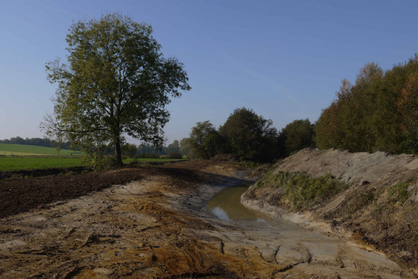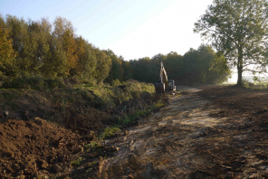 Zur Optimierung des Gewässers hat die Biologische Station zunächst das Ufer von Gehölzen freigestellt und diese abgeräumt. Dann wurde es ausgebaggert.
