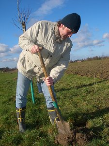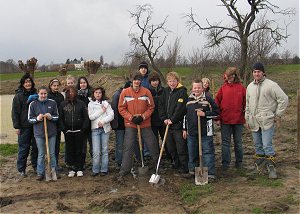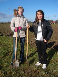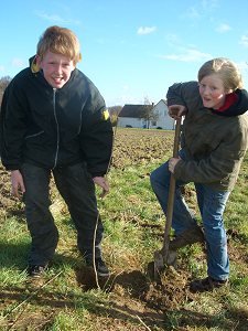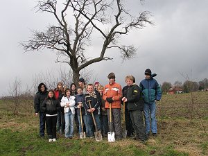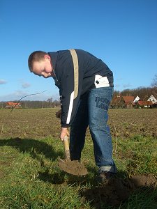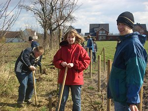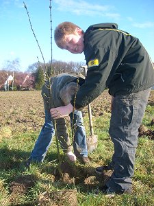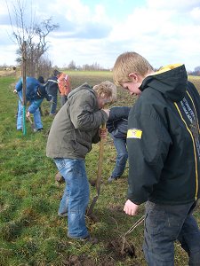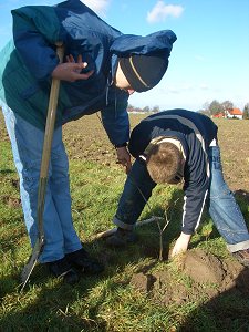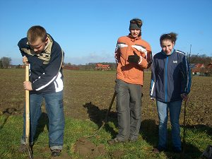 14 Schüler der Langenberger Konrad Adenauer Schule fassen tatkräftig mit an, als bei Wind und Wetter (Windstärke 5!) knapp 200 Sträucher, wie Hasel, Schneeball, Schwarzdorn, Rose und Pfaffenhütchen eingepflanzt werden!