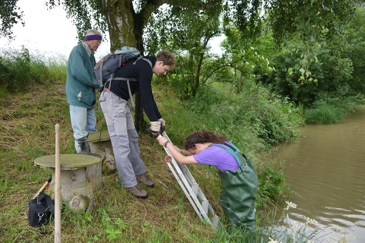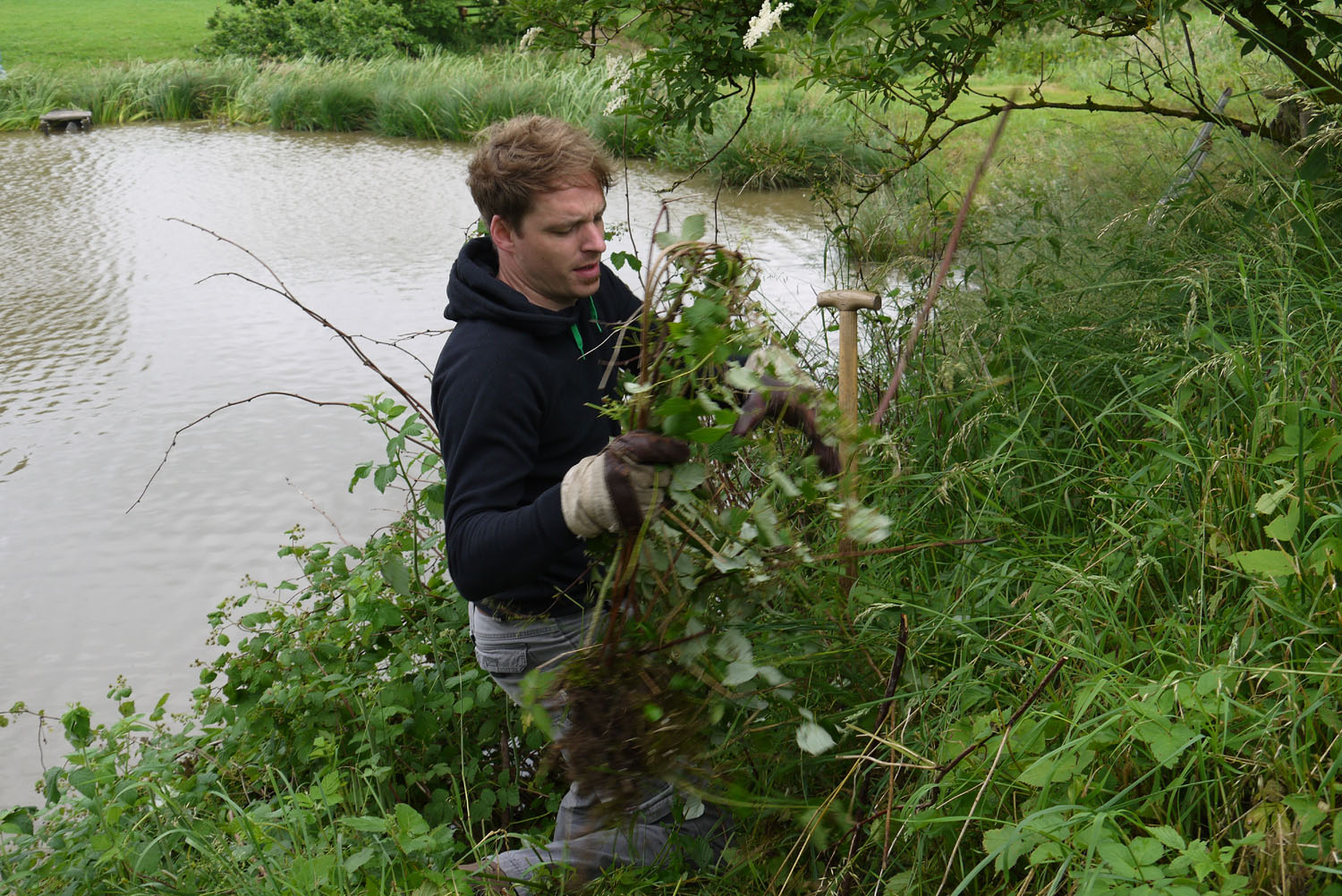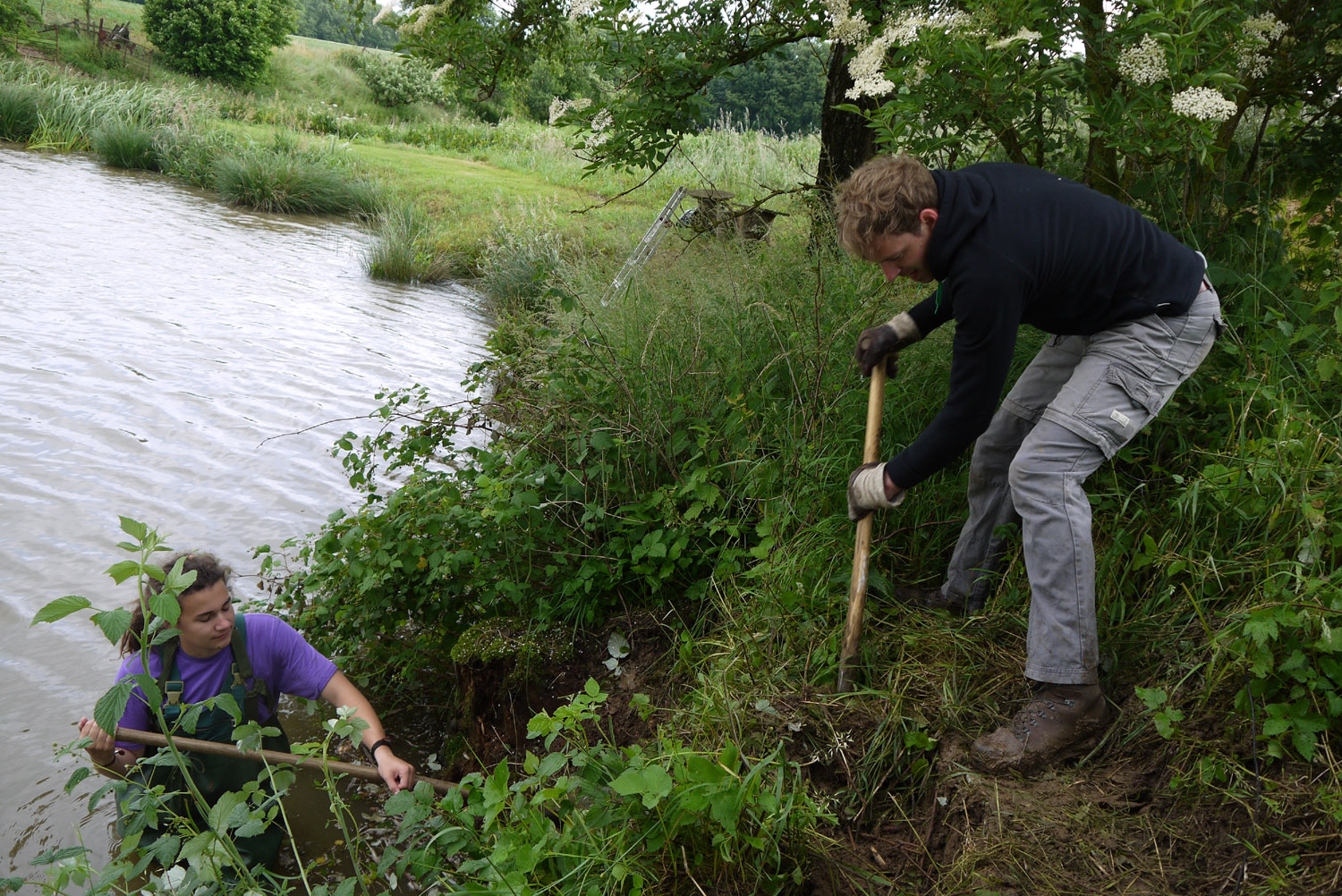| Nun zur Umsetzung: Praktikant Moritz steigt mit einer Wathose in den Teich, um vom Wasser aus an der Uferkante zu arbeiten. | |