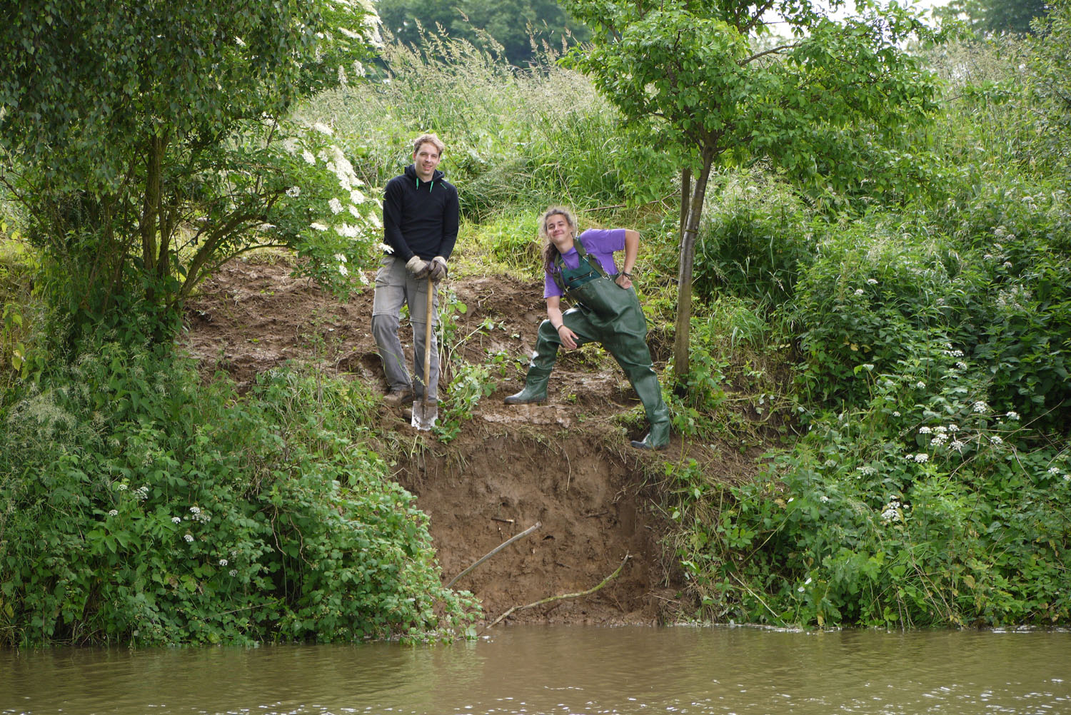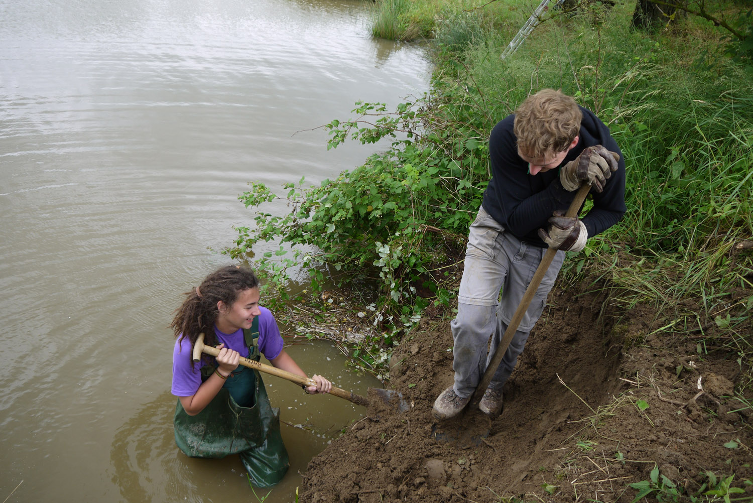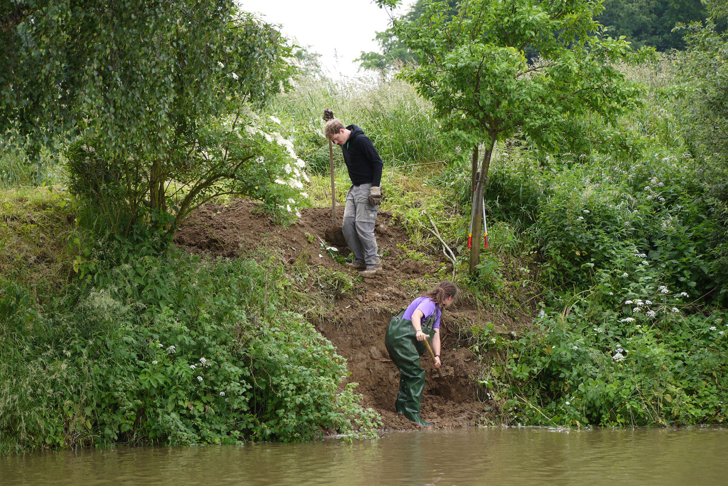 Von oben wird die Wand nun mit dem Spaten lotrecht nach unten abgestochen. Den anfallende Erde schaufelt Moritz von unten aus dem Gewässer ans Ufer. So arbeiten sich die beiden "durch " die Wand. | |