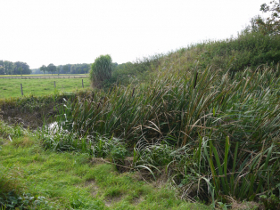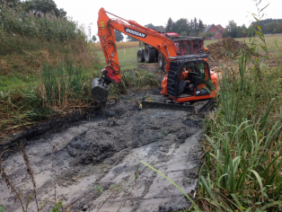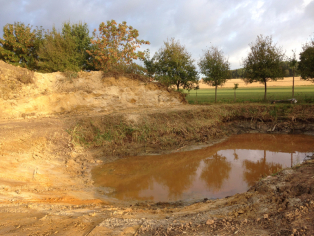 Die Biostation hat den Teich ausbaggern lassen, um Schlamm und Rohrkolben zu entfernen und die Wasserqualität zu verbessern. Das Südufer des Teiches wurde dabei abgeflacht, um eine Flachwasserzone zu schaffen. Dem wärmeliebenden Laubfrosch werden an diesem sanierten Gewässer somit optimale Bedingungen zur Laichablage geboten. |