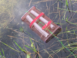 Mit Hilfe von Wasserfallen, so genannten Reusen können die Molche gefangen werden. Sie werden zur Bestimmung aus den Fallen genommen und sofort wieder ins Wasser frei gelassen. |
