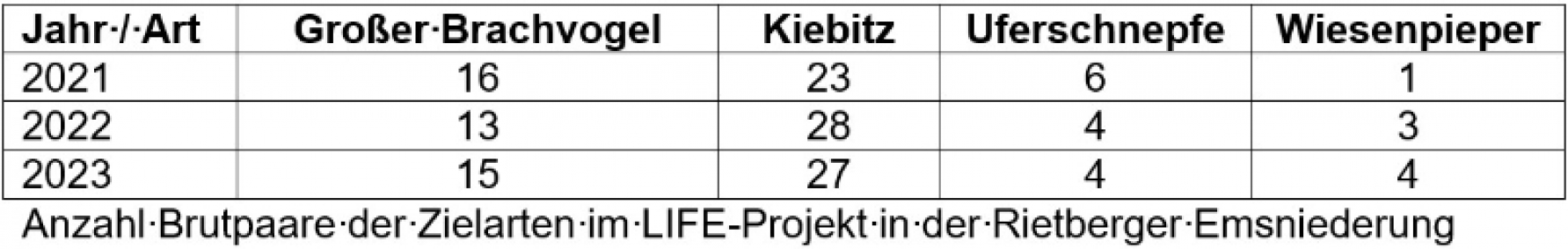 Über die Brutsaison 2021 und 2022 sind die Bestände der Zielarten erfasst worden. Positive Entwicklungen zeigen der Kiebitz und der seltene Wiesenpieper. Leichte Rückgänge sind bei der Uferschnepfe und dem Großen Brachvogel festgestellt worden.