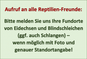„Kinder der Sonne“ - Reptilien kommen nicht nur im Süden vor!Auch in unserer Region sind kleinere Vorkommen von Eidechsen, Schleichen und Schlangen bekannt. Ein wesentlicher Schwerpunkt der Projekttätigkeiten ist die Verbesserung der Datengrundlage zu den Vorkommen der Reptilien, um gezielt Schutzmaßnahmen durchführen zu können.