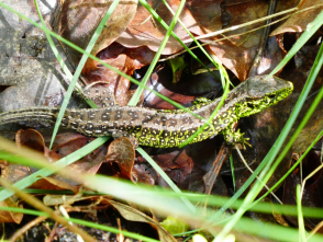 Zur Fortpflanzungszeit macht das Männchen der Zauneidechse mit seiner auffälligen Grünfärbung auf sich aufmerksam. (Bild: Annemarie Voss) |