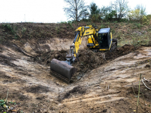 | Am Gewässergrund hat sich durch den Laubeintrag eine nährstoffreiche Schlammschicht gebildet. Sie führt auf Dauer zu einer Eutrophierung des Wassers, worauf Amphibien mit hohen Lebensraumansprüchen - wie Laubfrosch und Kammmmolch - sensibel reagieren. Mit Hilfe von Baggerarbeiten wurde der Schlamm mit dem Schilfbewuchs entfernt. |