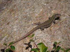 Die Mauereidechse (Podarcis muralis) ist seit Kurzem an einem neuen Standort in Gütersloh-Isselhorst angesiedelt - neben den bekannten Standorten am Bahnhof in Schloss Holte-Stukenbrock, im NSG Blömkeberg und im Botanischen Garten in Bielefeld. Es handelt sich bei den Individuen um eine dritte genetische Linie der Mauereidechse in unserer Region, die sich dort bereits mit einer Populationsgröße von ca. zehn Tieren in zwei Privatgärten etabliert hat und sich auch reproduziert: P. m. maculiventris-Ost (Venetienlinie). Der Umgang mit den allochthonen Vorkommen wird von den Experten sehr kontrovers gesehen. In NRW werden die Tiere nicht gefördert, da Mauereidechsen mit einheimischen Unterarten hybridisieren können und es zu Konflikten mit in gleichem Biotop vorkommenden Zaun- und Waldeidechsen kommen kann. |